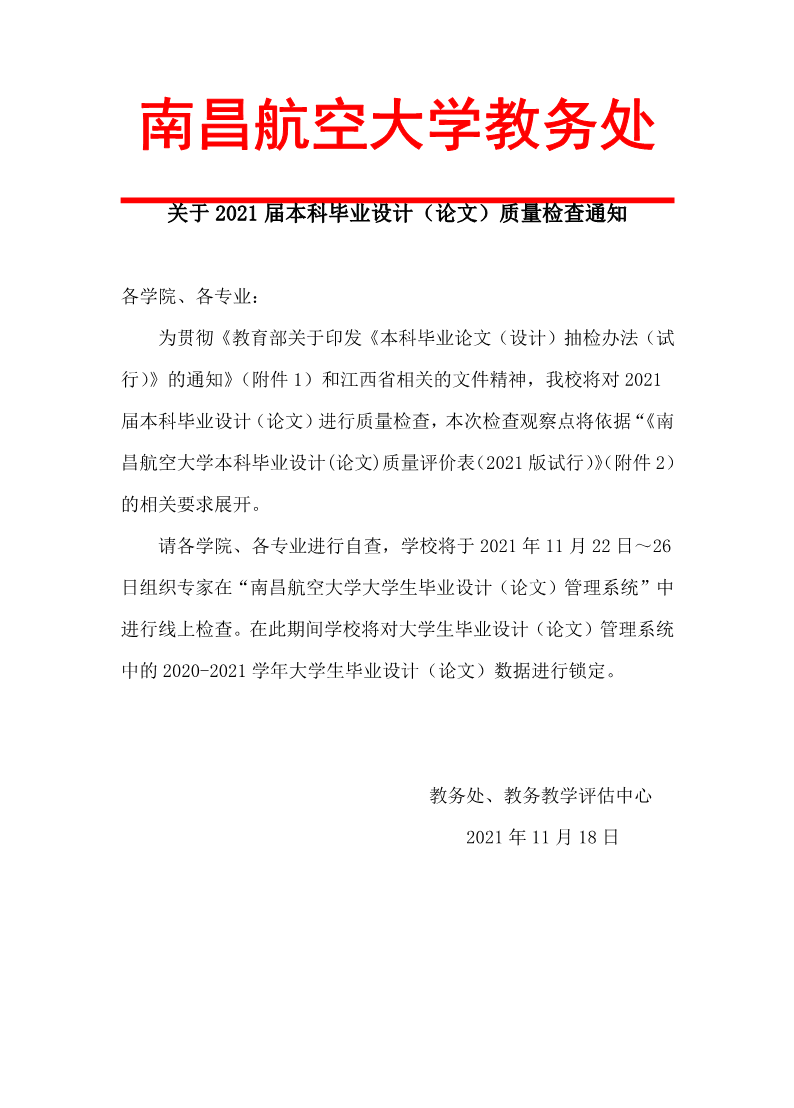 关于2021届本科毕业设计(论文)质量检查通知